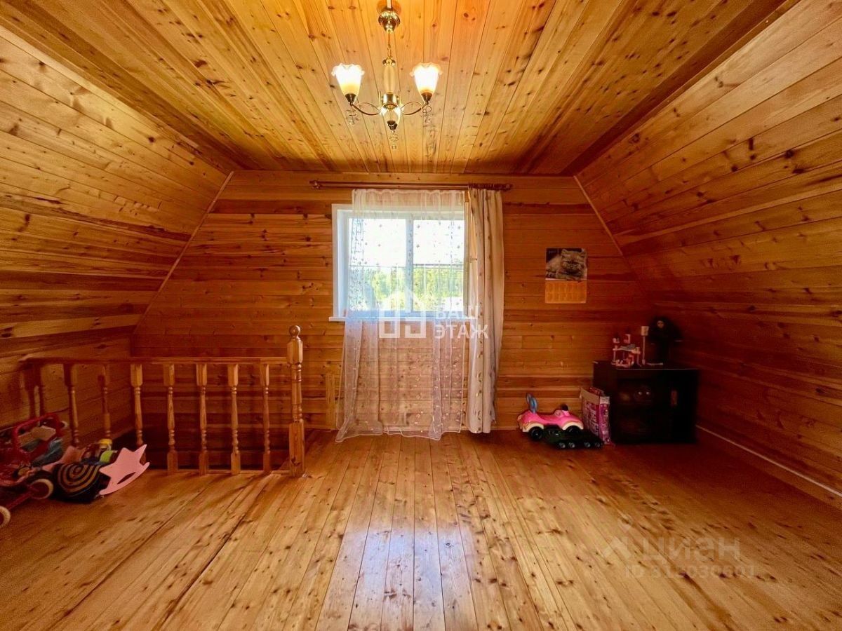 Дом состоит из двух этажей: первый — сруб с панорамной застекленной верандой (12 кв. м.), кухней-гостиной и душем (горячая вода от бойлера). На втором этаже расположены две спальни. Все окна — новые стеклопакеты. Дом оборудован печью-камином, что позволяет использовать его не только летом, но и в холодное время года. Есть чердак и Wi-Fi и летний водопровод