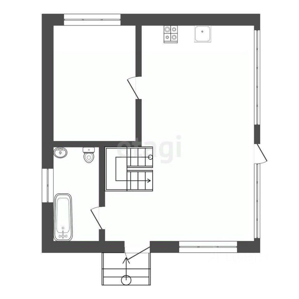 1 этаж: кухня-столовая, спальня, совмещенный санузел.