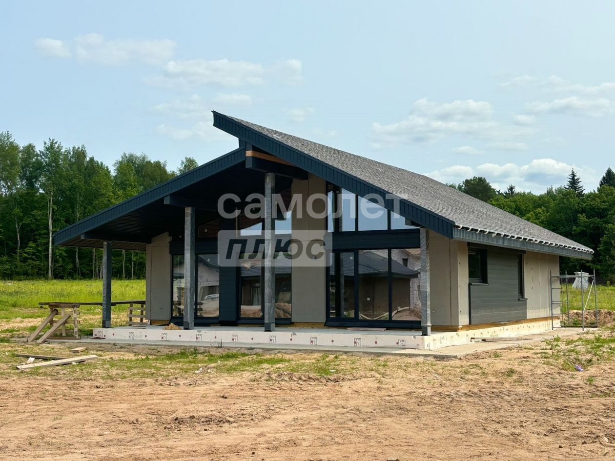Арт. 107446540 Пpодаетcя трехкомнатный дом 117 кв.м. - новый коттедж в скандинавском стиле с разноуровневой крышей, панорамным остеклением, просторной гостиной, двумя спальнями и большой крытой террасой.