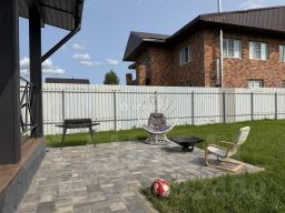 Тропинка, заезд, парковка и отмостка вымощены плиткой;