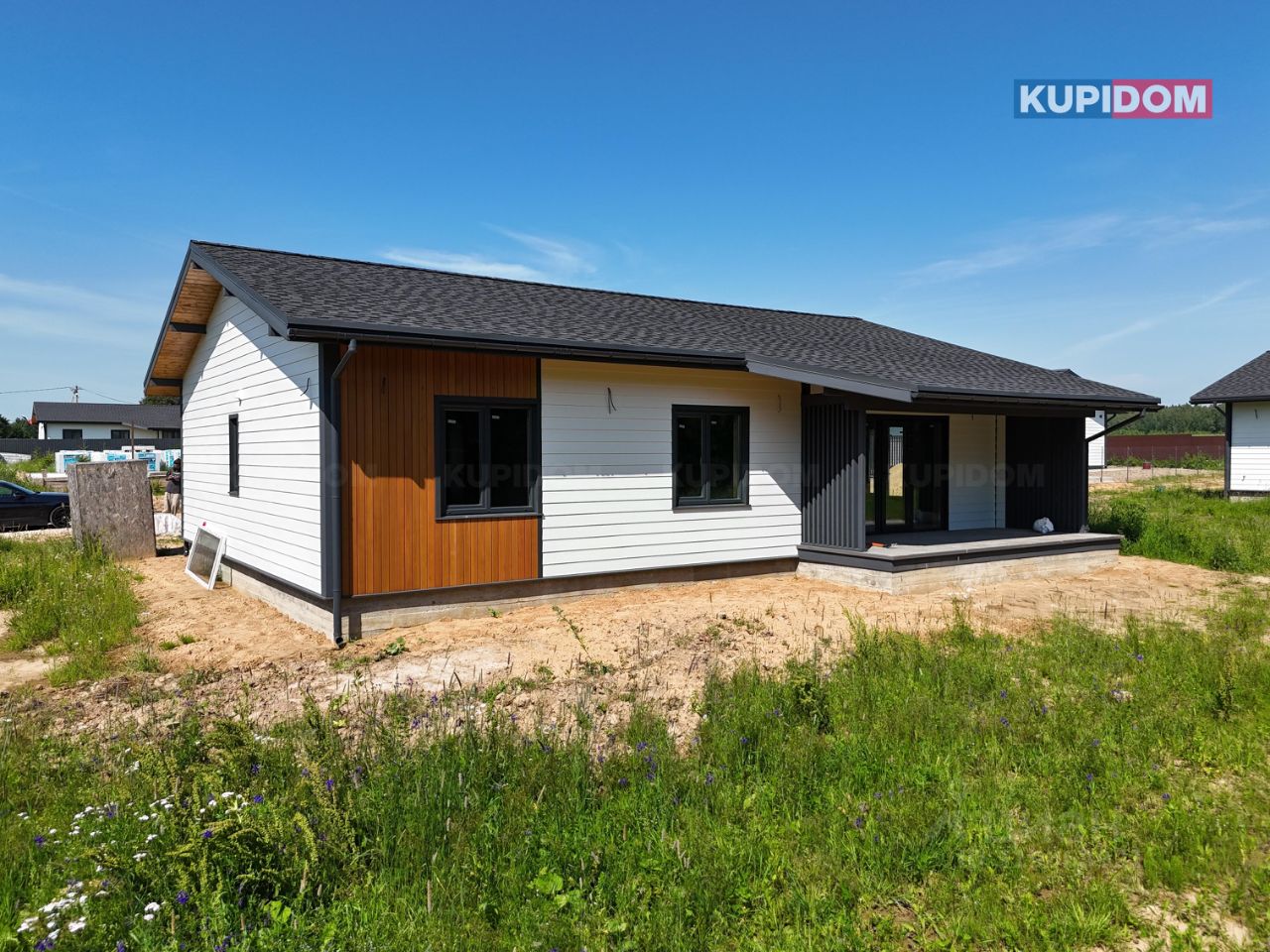 Отделка: Внешняя - фиброцементный сайдинг / лиственница; Террасная доска; Подсветка дома; Внутри - полы керамогранит / ламинат; Потолок - натяжной.
