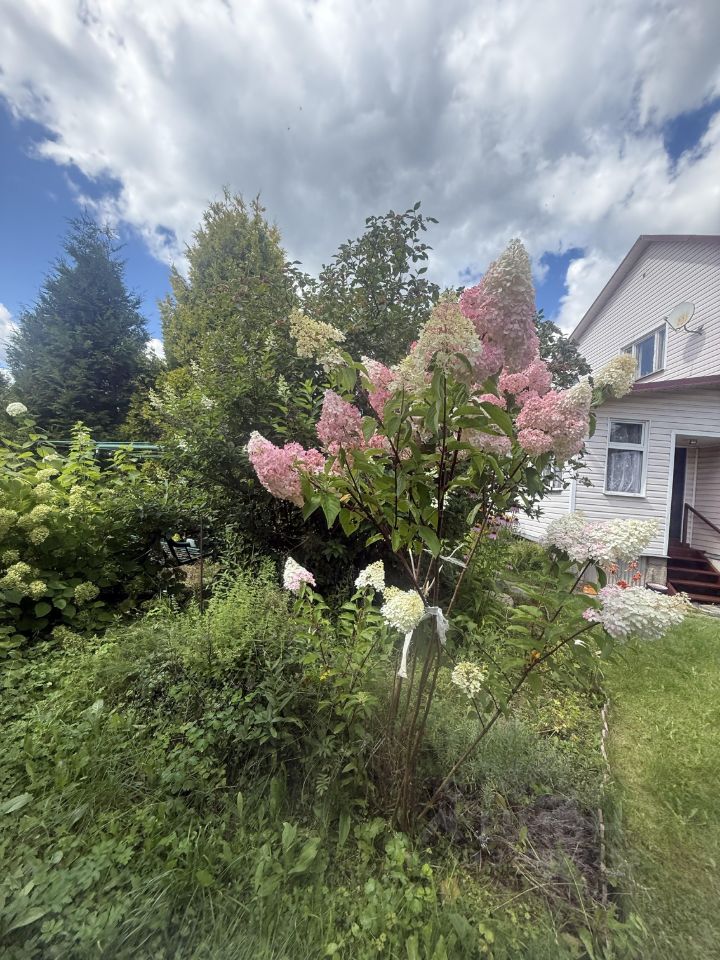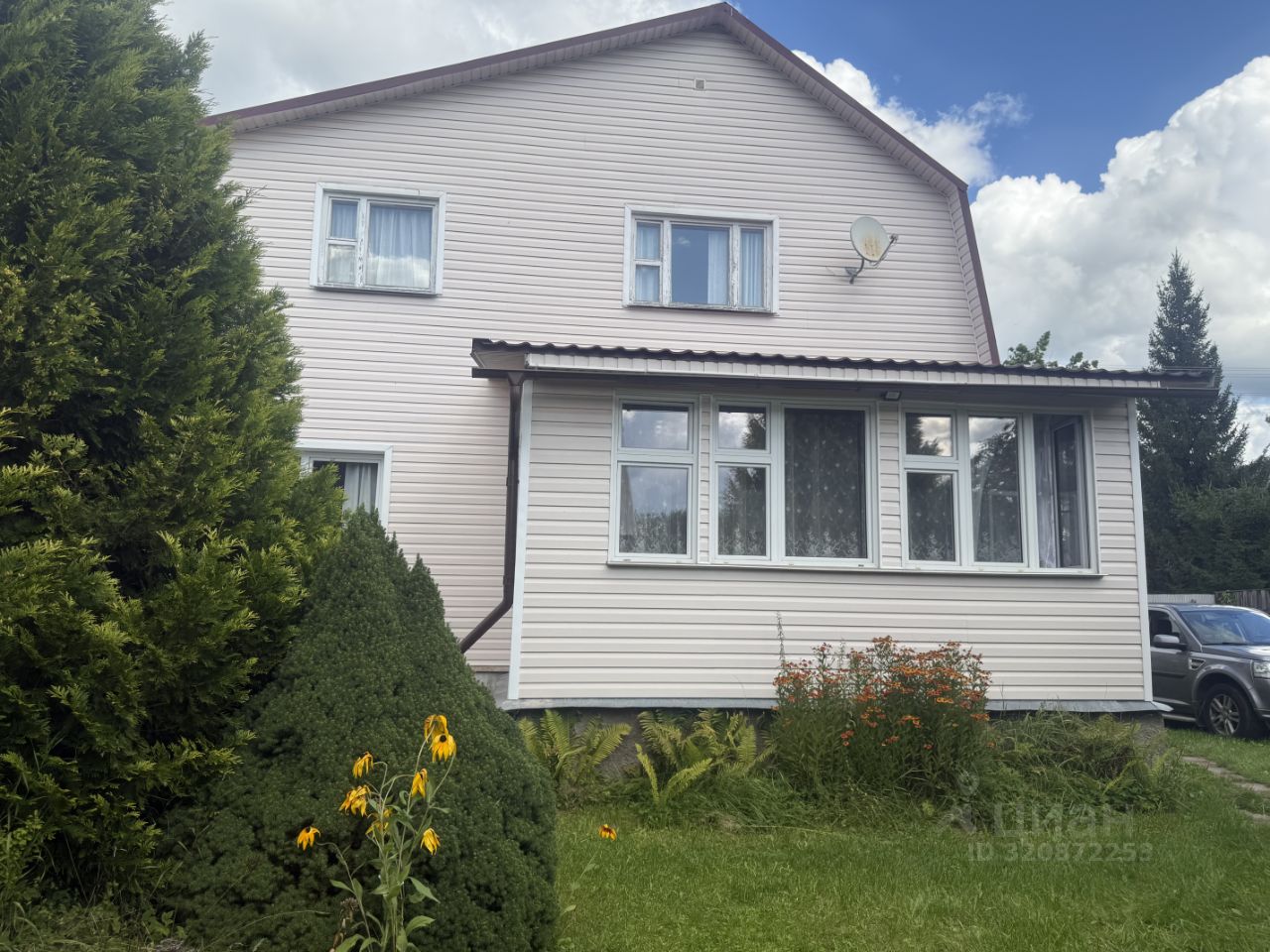 На участке парковка, плодовые деревья(яблони, груша,), кустарники (малина, смородина), большое количество декоративный деревьев, цветов.
