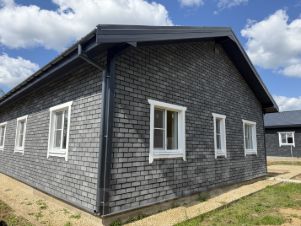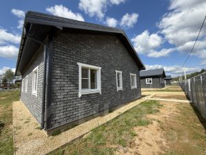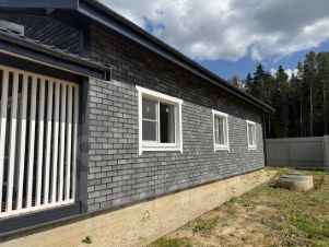 Отделка наружная: фасадная плитка Hauberk. Отделка внутренняя: покрашенная имитация бруса. Полы: ламинат. Крыша: металлочерепица (установлены водостоки, сделана вентиляция). Стеклопакеты: поворотно-откидные двухкамерные стеклопакеты с москитными сетками.