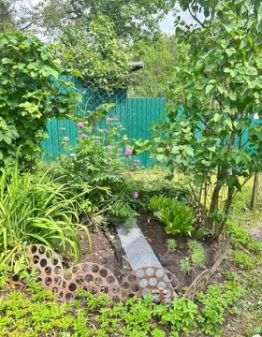 Много плодовых деревьев и небольшой прудик с уточками и рыбками.