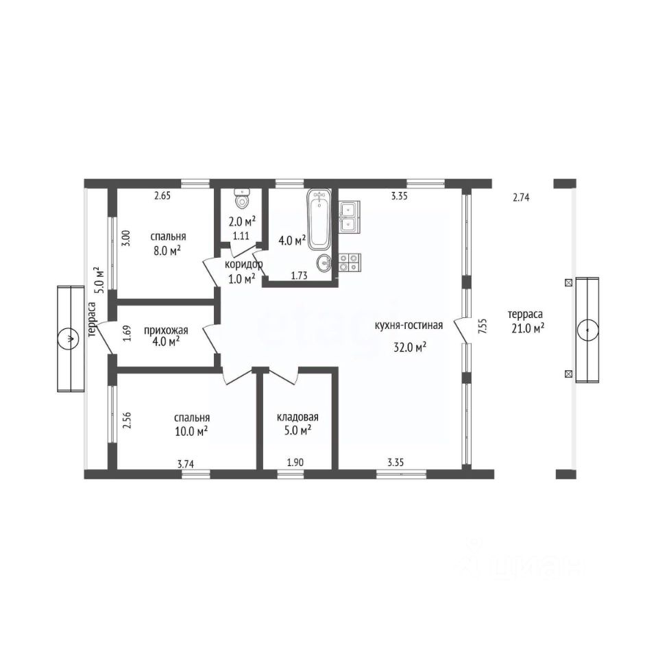 - Планировка: В доме расположены 2 комнаты (10 и 9 кв. м.), кухня-гостиная для семейных вечеров (25 кв.м.) и уютная терраса для утреннего кофе и вечерних встреч (15 кв.м.)