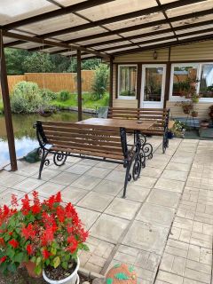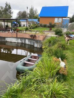 На участке расположена бревенчатая баня с летней кухней, комнатой отдыха и поленницей, пруд (25х8) с рыбой (карп, карась и др.), палуба с камином на берегу пруда, навес. Имеется отдельная кладовая для круглогодичного хранения зимних заготовок.
