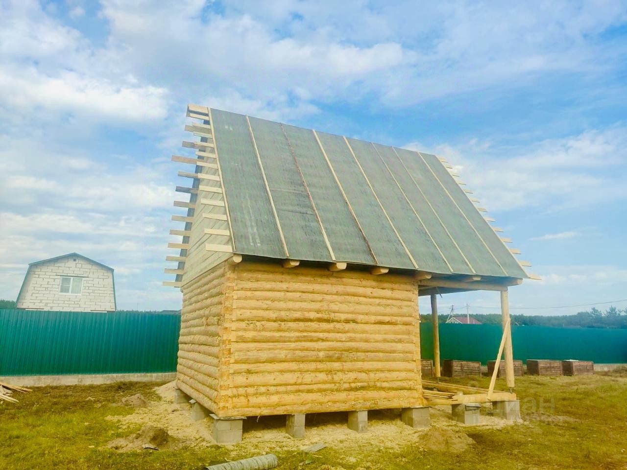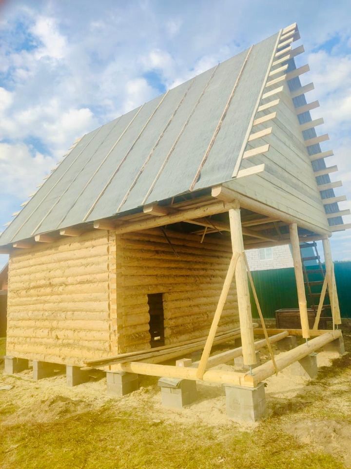 Сруб бани, размером 5м на 4м+2,5м выпуски, рубленный в "Лапу", протёсанный внутри (полулафет) ошкуренный рубанком, с крышей, высотой 4м, под второй этаж. В комплекте 2 двери, 2 окна. Фундамент - из бетонных блоков. Общая высота сруба -2,5м, плюс 4м - крыша второго этажа. Полное описание сруба смотрите на прилагаемых фото.