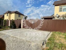 На участке площадью 6 соток, огороженном высоким забором, расположены различные элементы инфраструктуры: просторная площадка для отдыха и барбекю, ухоженный сад с плодовыми деревьями и кустарниками, цветочные клумбы, а также парковочное место для автомобиля.