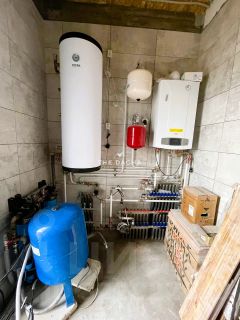 Коммуникации: Газ магистральный, Электричество 15 кВт, канализация автономный септик, вода собственная скважина (50 метров), отопление двухконтурный газовый котел, водяные теплые полы по всей площади дома+ радиаторы отопления, освещение умный дом. Оптоволоконный интернет по границе участка.