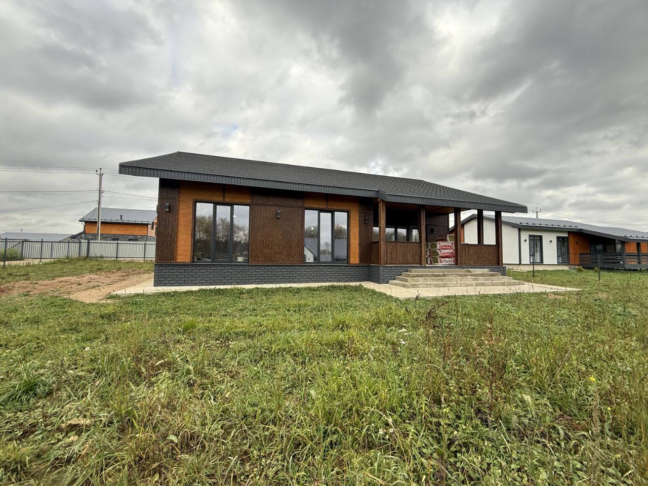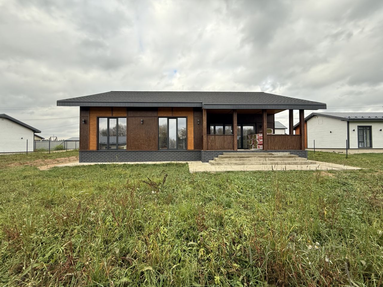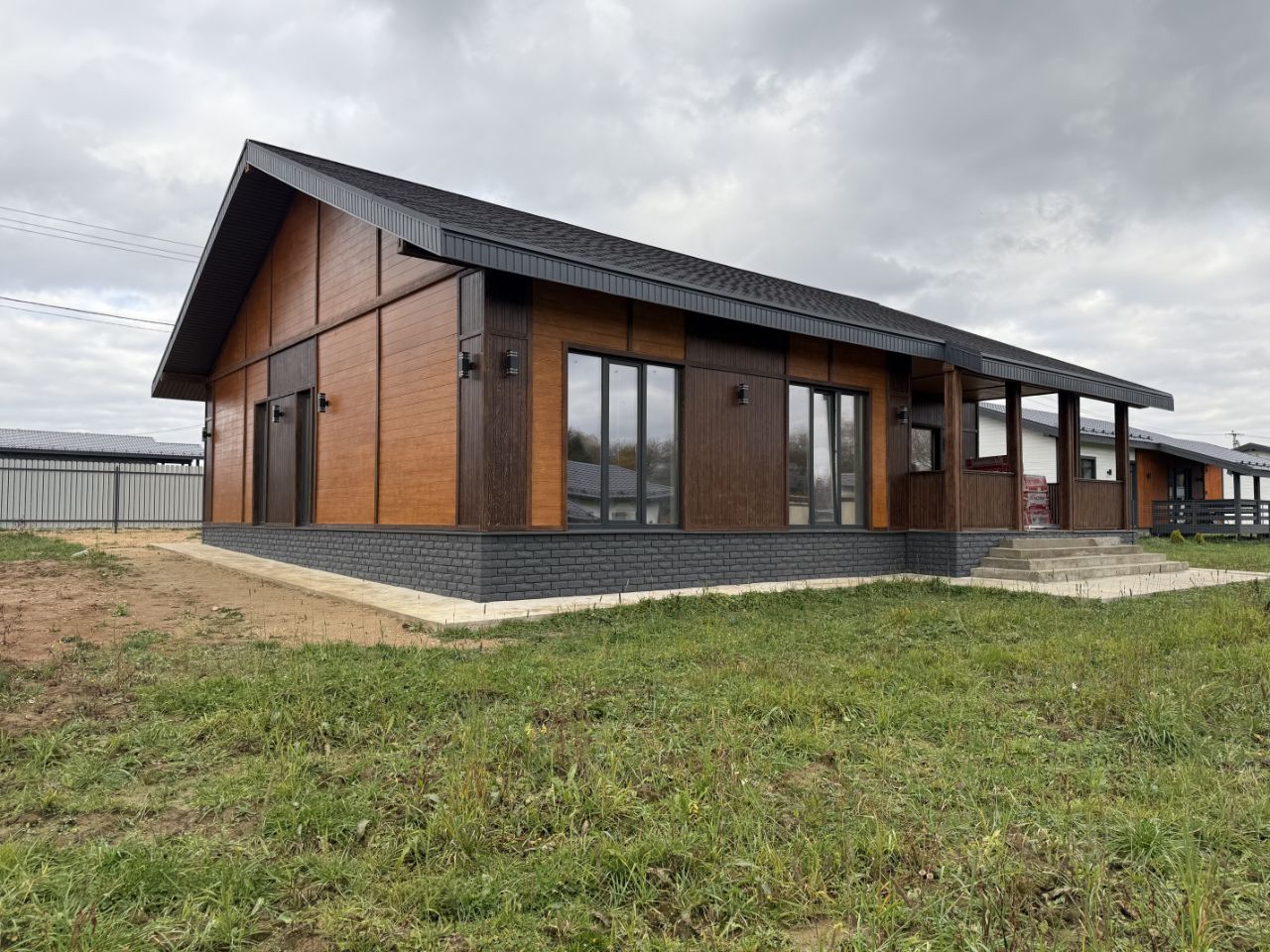 Дом выполнен из качественных материалов. Площадь 153 м2 (плюс веранда 23 м2). Фундамент - монолитная армированная плита с учетом выхода на терассу и крыльца. Материал стен газоблок 250 с дополнительным утеплением стен 50 мм.
