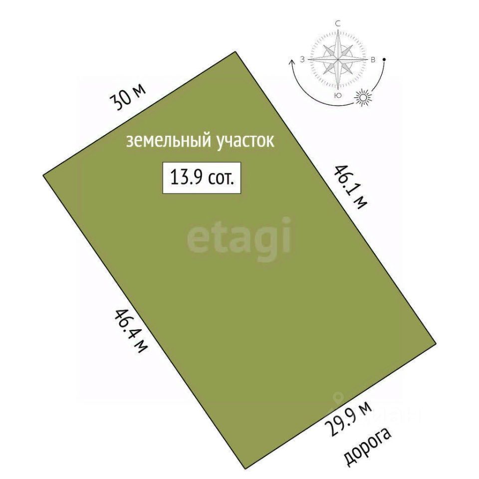 Площадь: 13.8 соток, ровный прямоугольник.