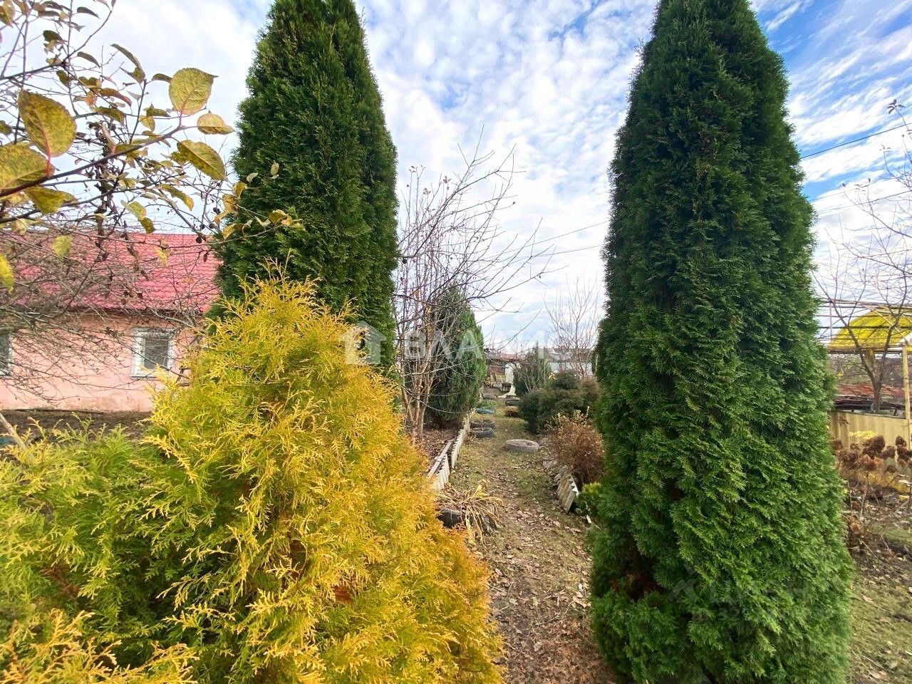 На участке растут груши, яблони, вишня, черешня, лещина, малина, клубника. Есть 3 теплицы, куры и утки.