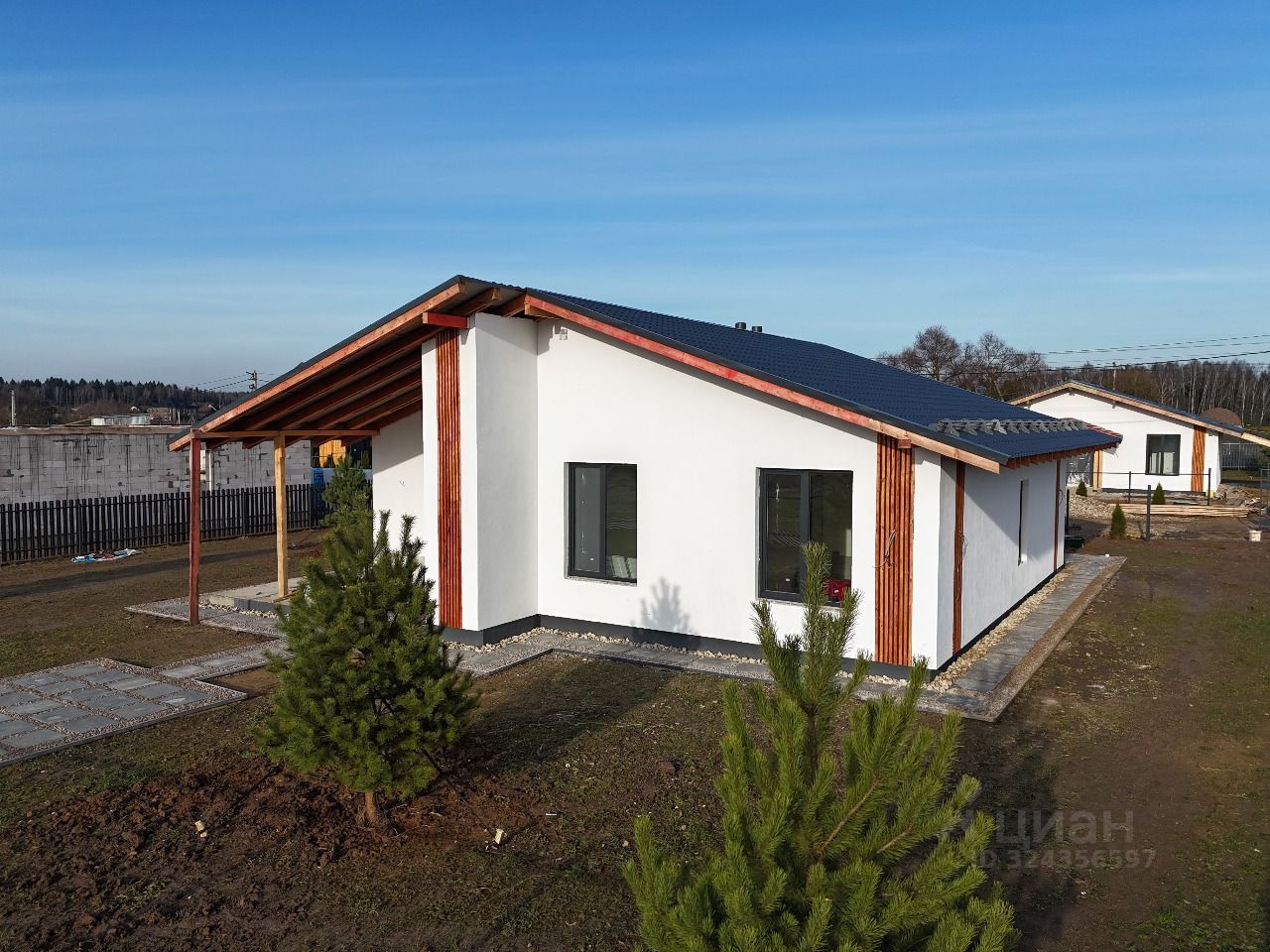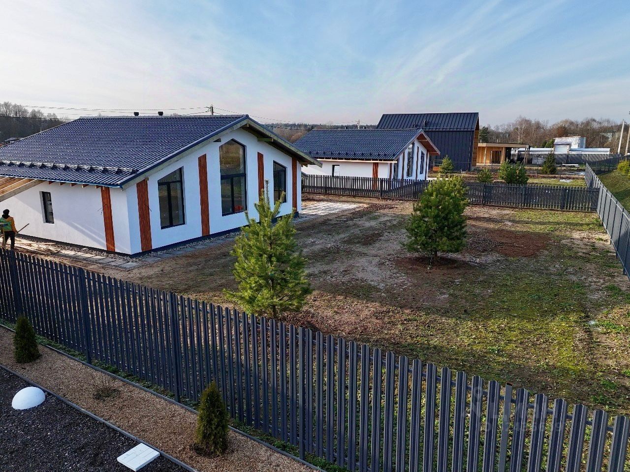 Участки сдаем полностью по всем сторонам с забором, откатными воротами, калиткой, отмостка и тропинки щебень+тротуарная плитка.
