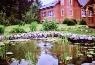 На участке есть пруд, беседка, баня и дом.