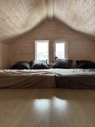 Планировка дома: прихожая, сан.узел, 2 спальных комнаты, кухня-гостиная с выходом на террасу. Мансардный этаж жилой. Мебель остается частично.