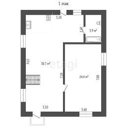 1 этаж : большая кухня-гостиная + комната - гостиная, санузел ,выход на террасу .