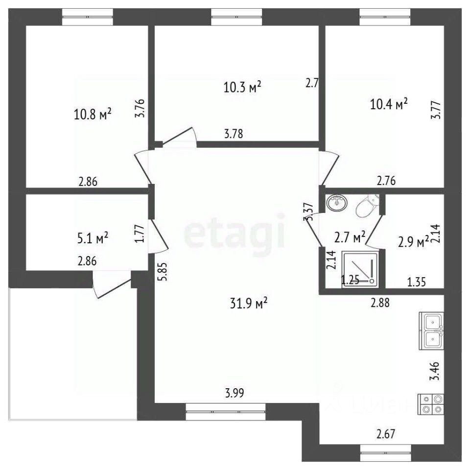 Три комнаты 10,8 / 10,3 / 10,4 кв. метров.