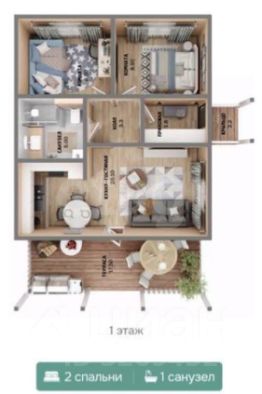 Комнаты изолированные. Кухня-гостиная площадью 20 м²с выходом на террасу.