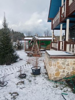 Территория ухожена и облагорожена. Высажены декоративные деревья и кустарники. Для отдыха на свежем воздухе установлены качели и зона барбекю.