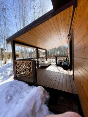 Площадь дома 60м2 (плюс 12м2 веранда), 2023 года постройки. Фундамент монолитная плита, стены брус 150*150 + утепление, фасад дома отделан имитацией бруса, пропитанной качественными декоративно-защитными составами, кровля металлочерепица + утепление (200мм), остекление качественный двойной стеклопакет.