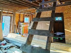 Планировка первого этажа: Прихожая, гостиная - кухня, санузел, баня. Терраса 2х7.5м с выходом из кухни - гостиной.