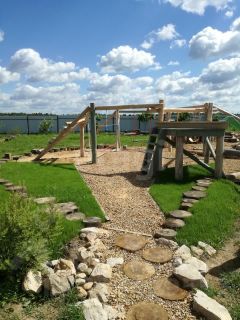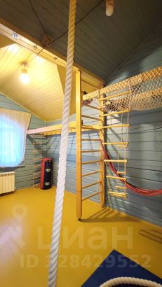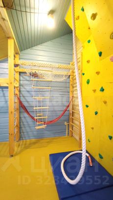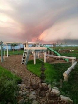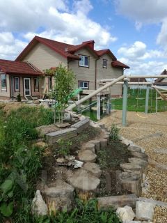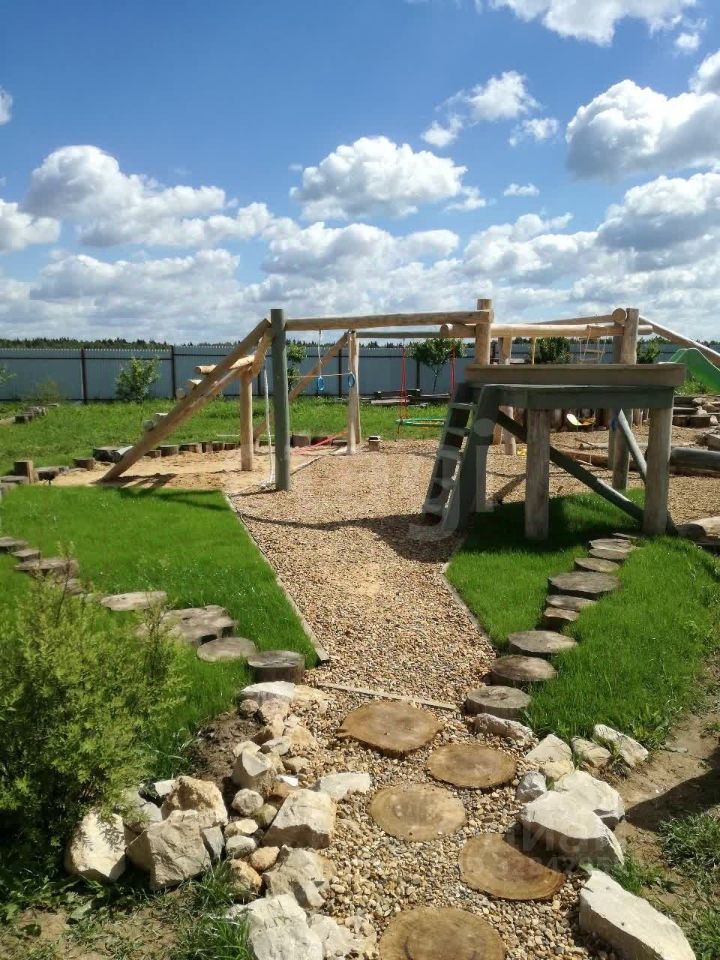 На участке альпийская горка, детская игровая площадка, плодовые деревья, зона барбекю.