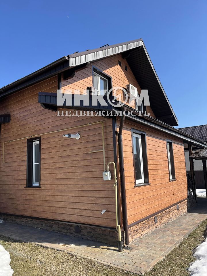 О доме: фундамент ленточный, утеплен и облицован натуральным и декоративным камнем. Стены брус, обшитый блок-хаусом. Весь дом утеплен. Есть застекленная терраса. Крыша металлочерепица. Гараж с электроприводом. Навес для автомобиля. На 1 этаже расположен большой зал с электрокамином, сауна, санузел. На 2 этаже 3 спальни, санузел. На полу моющийся ламинат. Везде установлены кондиционеры.