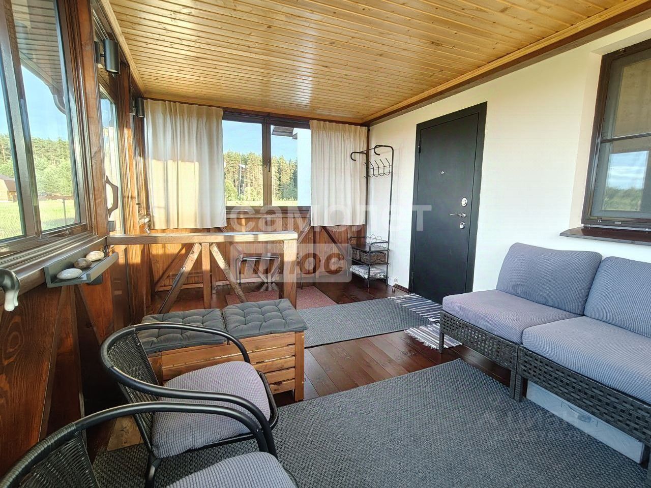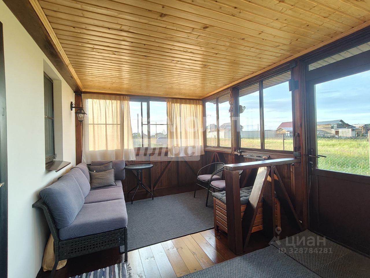 Веранда 15 м² , обшитая и застеклённая, с мебелью от IKEA — идеальное место для отдыха в любое время года.