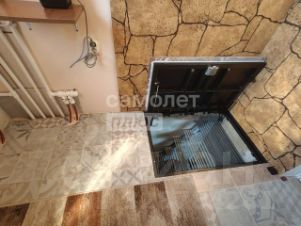 Обустроенный подвал с металлическими стеллажами и люком на газовых амортизаторах — удобное место для хранения.
