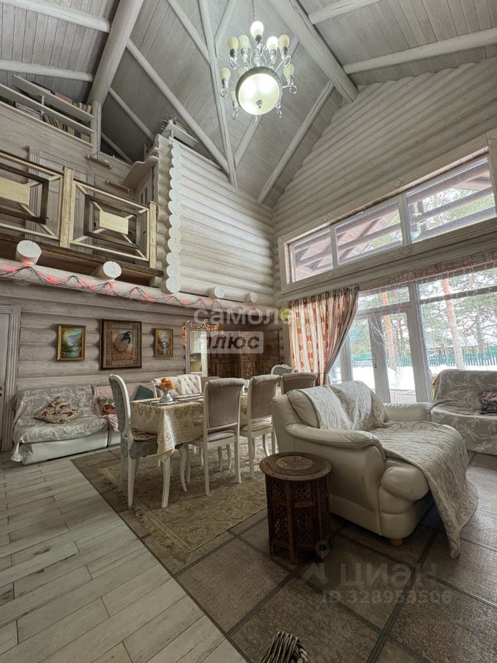 Гостиная с двухуровневыми окнами и выходом на террасу. Открывается вид на сосновую поляну с уголком для барбекю.