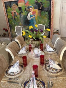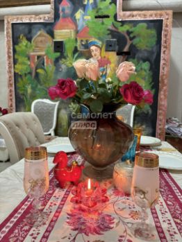 Вместительный стол в центре и расписная русская печь — особая атмосфера уюта и тепла. Идеальное место для семейных обедов и долгих бесед.