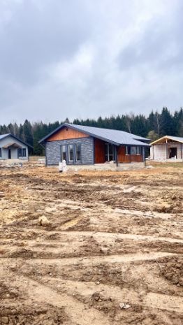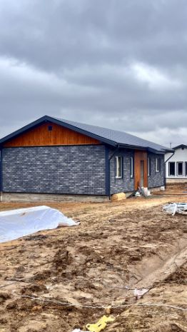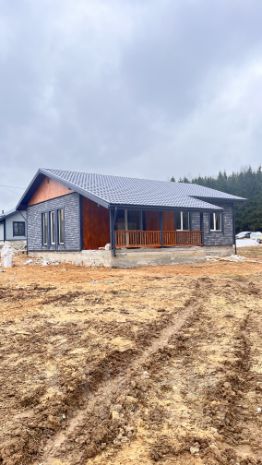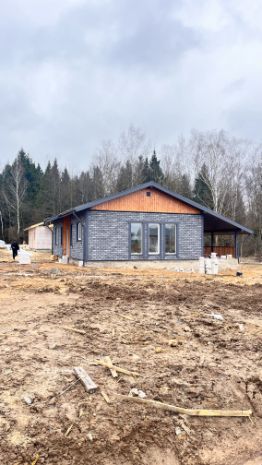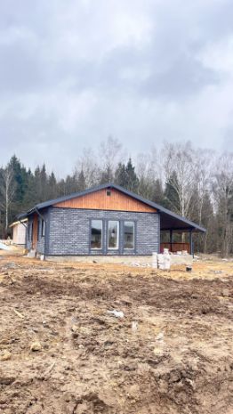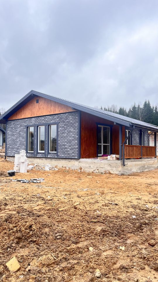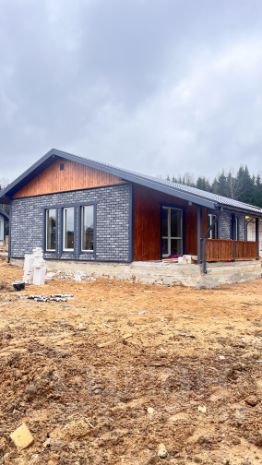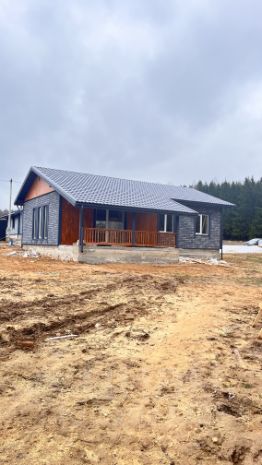 Дом площадью 100 м² имеет монолитный, армированный фундамент с тёплым водяным полом на всей площади. Стены выполнены из газоблока с утеплением. Внутренняя отделка включает плитку и имитацию бруса, а внешняя отделка также выполнена из имитации бруса. Кровля покрыта металлочерепицей, полы — плиткой и ламинатом, потолок натяжной, белого матового цвета.
