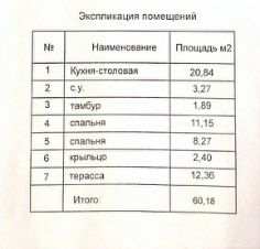 Удобная планировка: две спальни (11.15м2 и 8.27м2) и кухня-гостинная (20.84м2), тамбур, с/у, крыльцо + терраса.