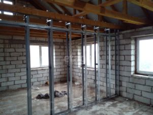 Большая часть 1-ого этажа отделана, сделан отличный ремонт. Есть большой камин, диван, кухонный гарнитур, газовая плита. Прекрасно отделанная ванная комната с душевой кабиной и ванной. По всему дому проведено газовое отопление. На втором, мансардном и цокольном этажах сделана улучшенная черновая отделка. На участке расположена добротная баня с мансардным этажом, летний душ. Есть котлован под бассейн или пруд (выложен плитами). Коммуникации все заведены. Вода из собственного колодца, септик. На противоположной от главного дома стороне участка находится ещё один дом-баня (деревянный). Забор из профлиста. Два въезда с воротами. Есть разнообразные плодово-ягодные деревья и кустарники. Вокруг населённого пункта отличный грибной лес. В шаговой доступности озеро, речка. Великолепный вид.
