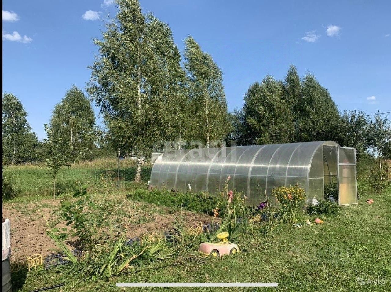 Посажены молодые яблони, груши, также посажены кустарники. Рядом с участком лес.