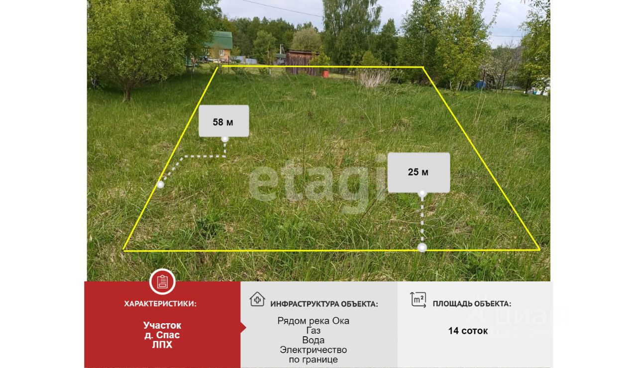 Продается отличный участок в с.Спас Калужской области, в непосредственной близости от города. От центра Калуги 15 км. Участок площадью 14 соток. Участок ровной прямоугольной формы (прим 58х25 м). Прекрасно подойдет для строительства дома для круглогодичного проживания. По границе проходят газ, вода, электричество. Огорожен с трех сторон от соседей сеткой рабицей. Участок не обработан. Место очень живописное: красивые виды на заливные луга, на место слияния рек Ока и Угра, с участка открывается вид на Спасо-Преображенский монастырь. Звоните! С удовольствием все расскажу и организую показ!