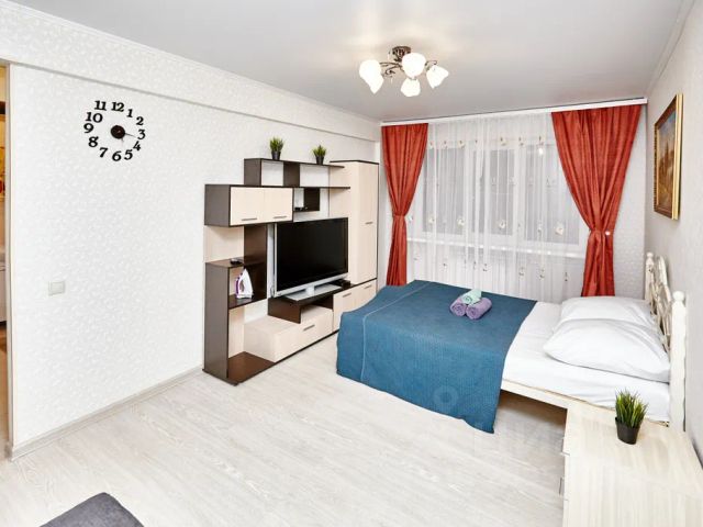 В квартире современная мебель, новая сантехника, натяжные потолки, стеклопакеты, хорошая шумоизоляция, панорамное окно в пол, кондиционер, фен, утюг, гладильная доска, сушилка для белья, стиральная машина. Есть все необходимое для проживания. В Вашем распоряжении: большая двуспальная кровать