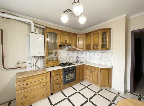 Просторная кухня со встроенным гарнитуром. Можно готовить борщ и не упираться локтями в стену. Встроенная техника спрятана за фасадами — никто не догадается, что вы жарите котлеты. Всё блестит, всё новое.
