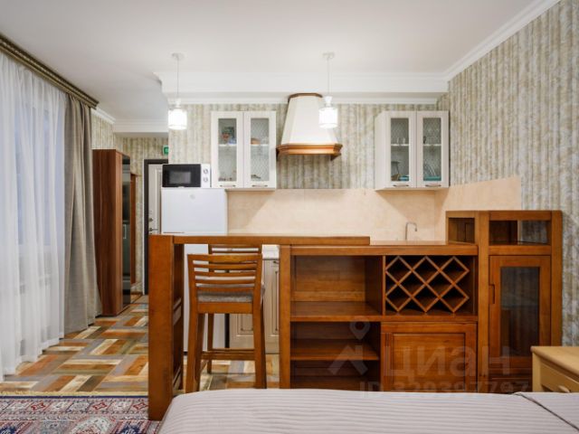 Имеется телевизор, кондиционер, отопление, шкаф, вешалка, стол обеденный и рабочий, холодильник, стулья, корзина для мусора, чайник.