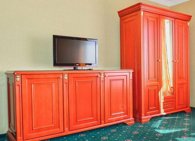 В прихожей и гостиной комнате располагаются гардероб, вешалка для верхней одежды, зеркало в полный рост, тумбочка для багажа, телевизор с экраном 32 дюйма, обеденный стол с пятью стульями, мягкий кожаный двухместный диван со спальным местом и двумя кожаными креслами, два журнальных столика к дивану, индивидуальный цифровой сейф, мини-бар, чайник, набор чайной посуды.