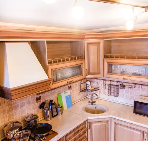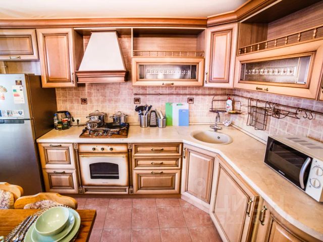 Кухня оснащена всеми необходимыми бытовыми приборами (холодильник, микроволновка, электрический чайник, духовка) и столовыми принадлежностями (кастрюли, сковорода, кружки, тарелки, столовые приборы).
