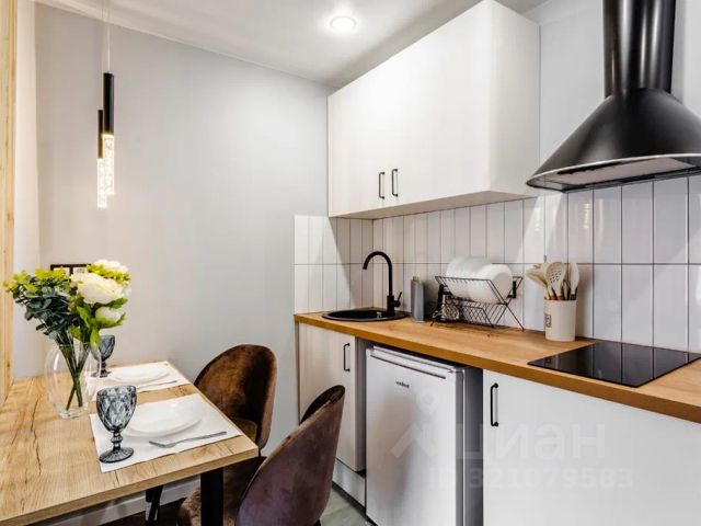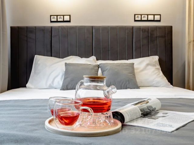 Ананас - это небольшая, но уютная квартира студия, расположенная на улице Курчатова в городе Обнинск. Интерьер студии выполнен в ярких голубых и желтых тонах, что придает ей свежесть и жизнерадостность. Основным элементом интерьера является двуспальная кровать, расположенная у стены. За изголовьем кровати висит картина с изображением ананаса, что является отсылкой к названию студии. Рядом с кроватью стоит шкаф для одежды и тумба с телевизором. Маленькая кухня оборудована всей необходимой техникой: плитой, вытяжкой, микроволновой печкой и холодильником. Барная стойка отделяет кухню от зоны отдыха и добавляет пространству функциональности. Санузел выполнен в желтых тонах, что гармонирует с общим интерьером. Вся сантехника и аксессуары подобраны в тон стенам и полу, создавая единый образ. Ананас подойдет для молодых пар или студентов, которые ценят яркость, стиль и минимализм. Студия станет отличным местом для отдыха после учебы или работы, а также для приема гостей.